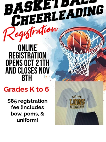 Basketball Cheerleading Registration is now open until November 8th. Please use the google form to register. If you have any questions, please contact Becky at bgibney@redlionpa.org